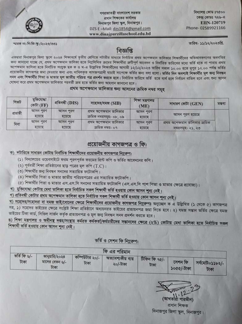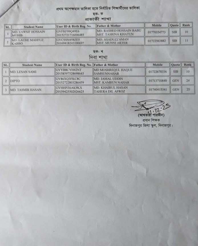 ২০২৪ শিক্ষাবর্ষের প্রথম অপেক্ষমান তালিকা হতে ভর্তি সংক্রান্ত বিজ্ঞপ্তি